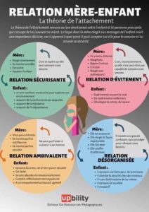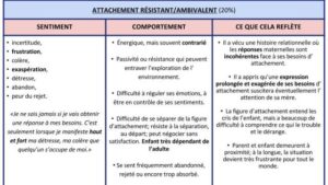 Sources: L’attachement: un instinct oublié de Yvane Wiart; www.apprendreaeduquer.fr: article Les trois types d’attachement construits dans l’enfance et leurs répercussions à l’âge adulte.
